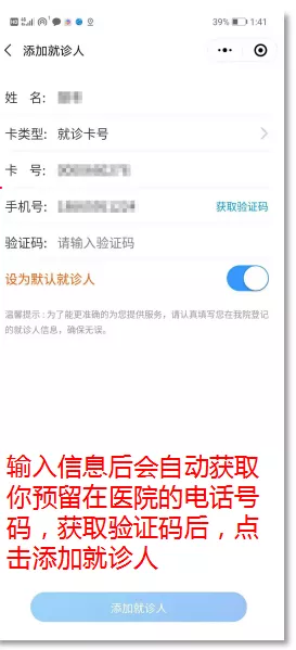 患者首次進入診室,需添加就診人,輸入在醫院的就診信息,綁定身份。