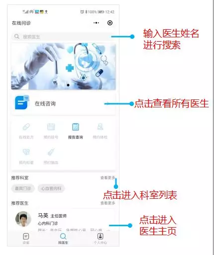 方式一:通過“找醫生”界面查找醫生,發起問診咨詢: