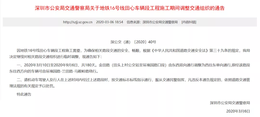 2020年3月10日至2020年9月6日,共180天。金田路(田頭上村公交站至環境園路口段)由東西雙向通行,調整為西往東單向通行。