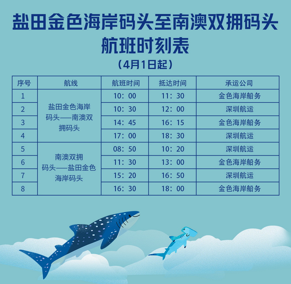 據了解,“鹽田-南澳”海上交通往返航線自3月12日正式復航,每天共4班。深圳航運集團增開后,該航線航班數量將恢復至疫情前的水平,達到每天8班。其中,由鹽田金色海岸碼頭至南澳雙擁碼頭新增航班時間為:10時30分和17時;由南澳雙擁碼頭至鹽田金色海岸碼頭新增航班時間為8時50分和15時20分。廣大市民及旅客朋友可通過深圳航運旗下公眾號“鵬星會”查詢航班信息及訂票,單程成人票60元/人。