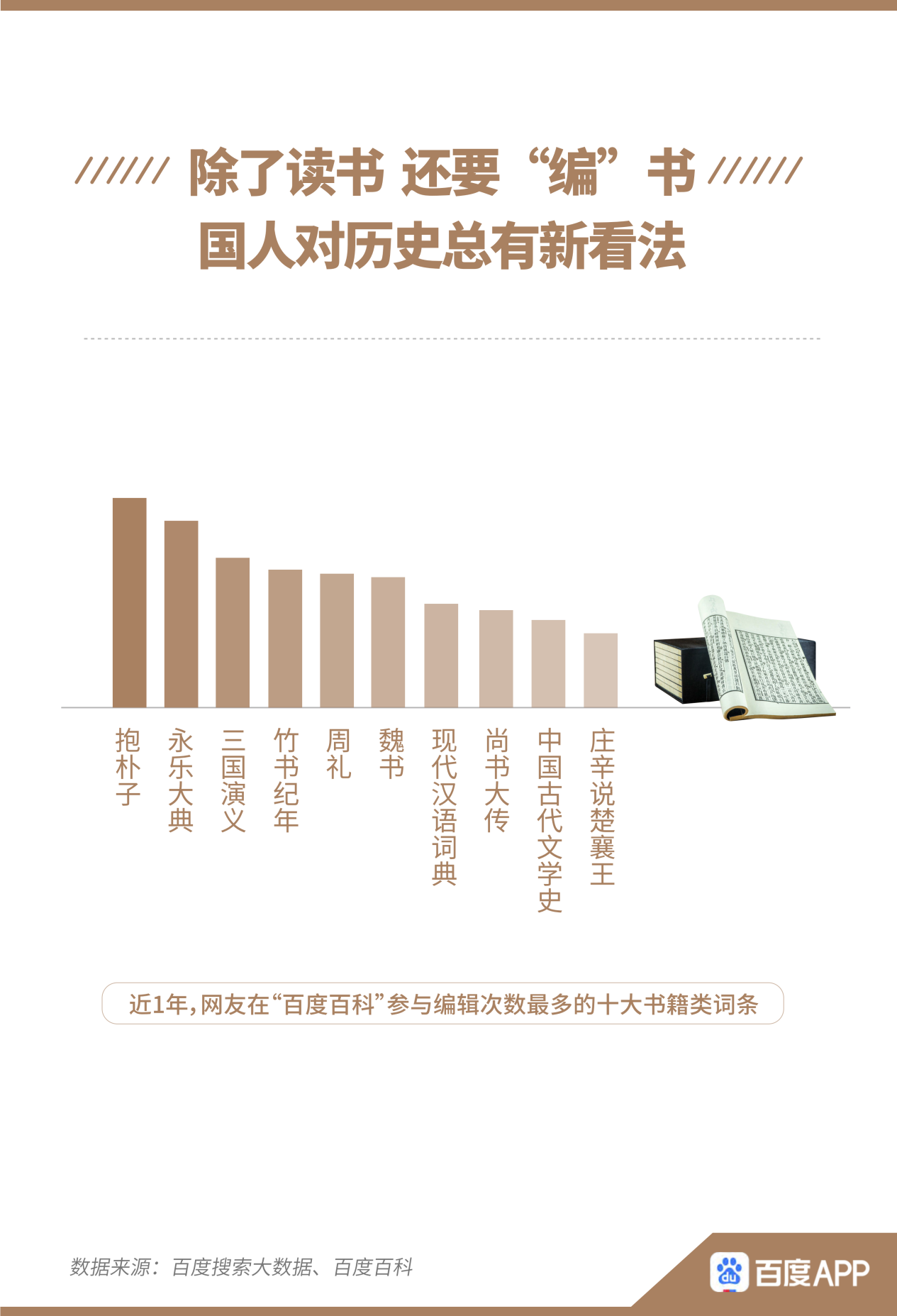 不僅讀書,這一屆網(wǎng)友還要“編”書。其中,網(wǎng)友對歷史著作總有新看法。報告顯示,近1年,網(wǎng)友在百度百科參與編輯次數(shù)最多的十大書籍類詞條,歷史著作占7席。《永樂大典》在600年后仍舊“編輯”不停。