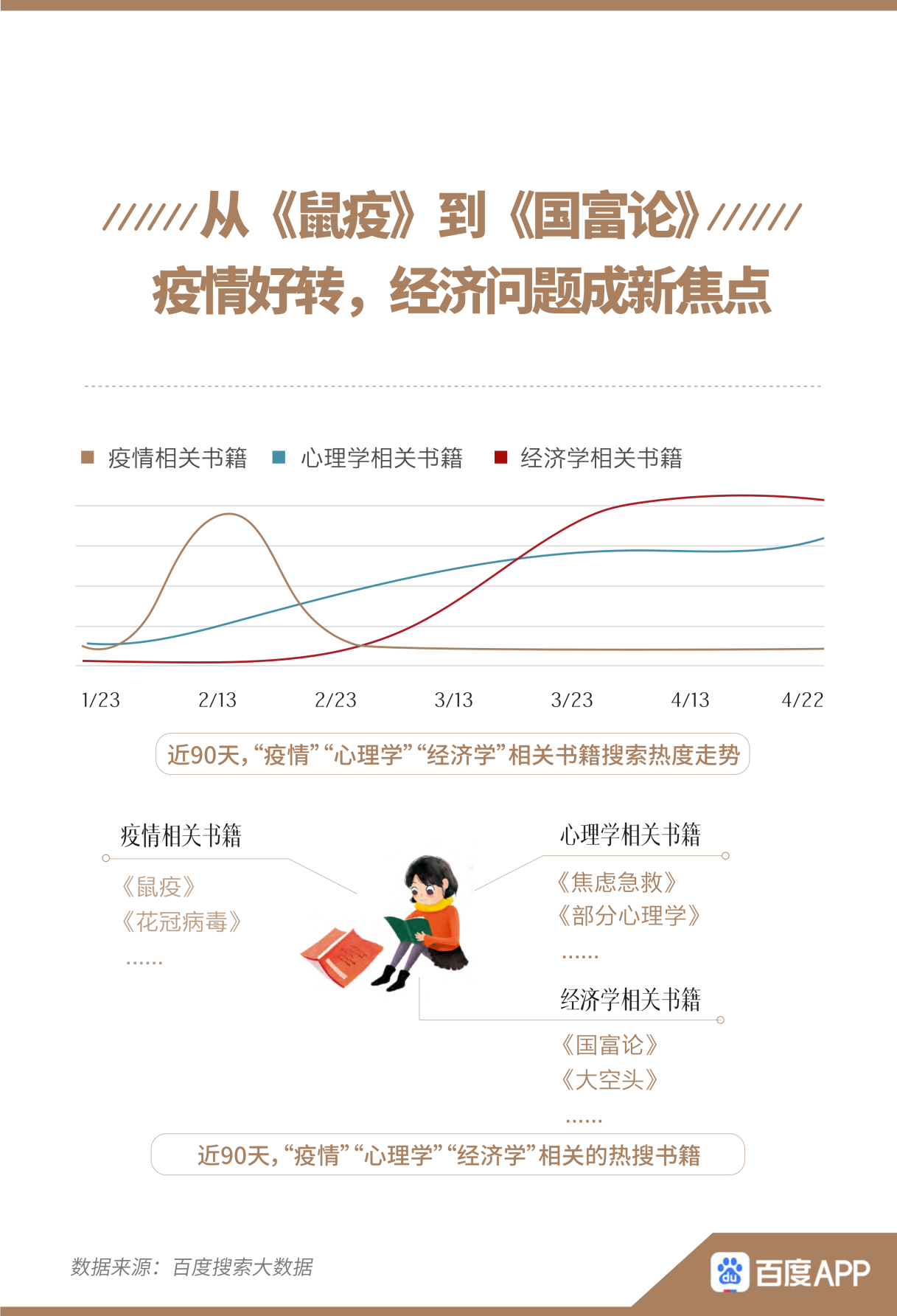 與此同時,疫情變化也影響著人們的閱讀“口味”。報告顯示,在疫情暴發(fā)之初,與“疫情”相關(guān)書籍的搜索熱度迅速上升,《鼠疫》、《花冠病毒》等具有疫情背景的書籍成為熱搜。隨著國內(nèi)疫情好轉(zhuǎn),疫情對心理、經(jīng)濟的影響逐漸受到人們更多關(guān)注,《焦慮急救》、《國富論》等“心理學(xué)”、“經(jīng)濟學(xué)”相關(guān)書籍的搜索熱度均在3月上漲。