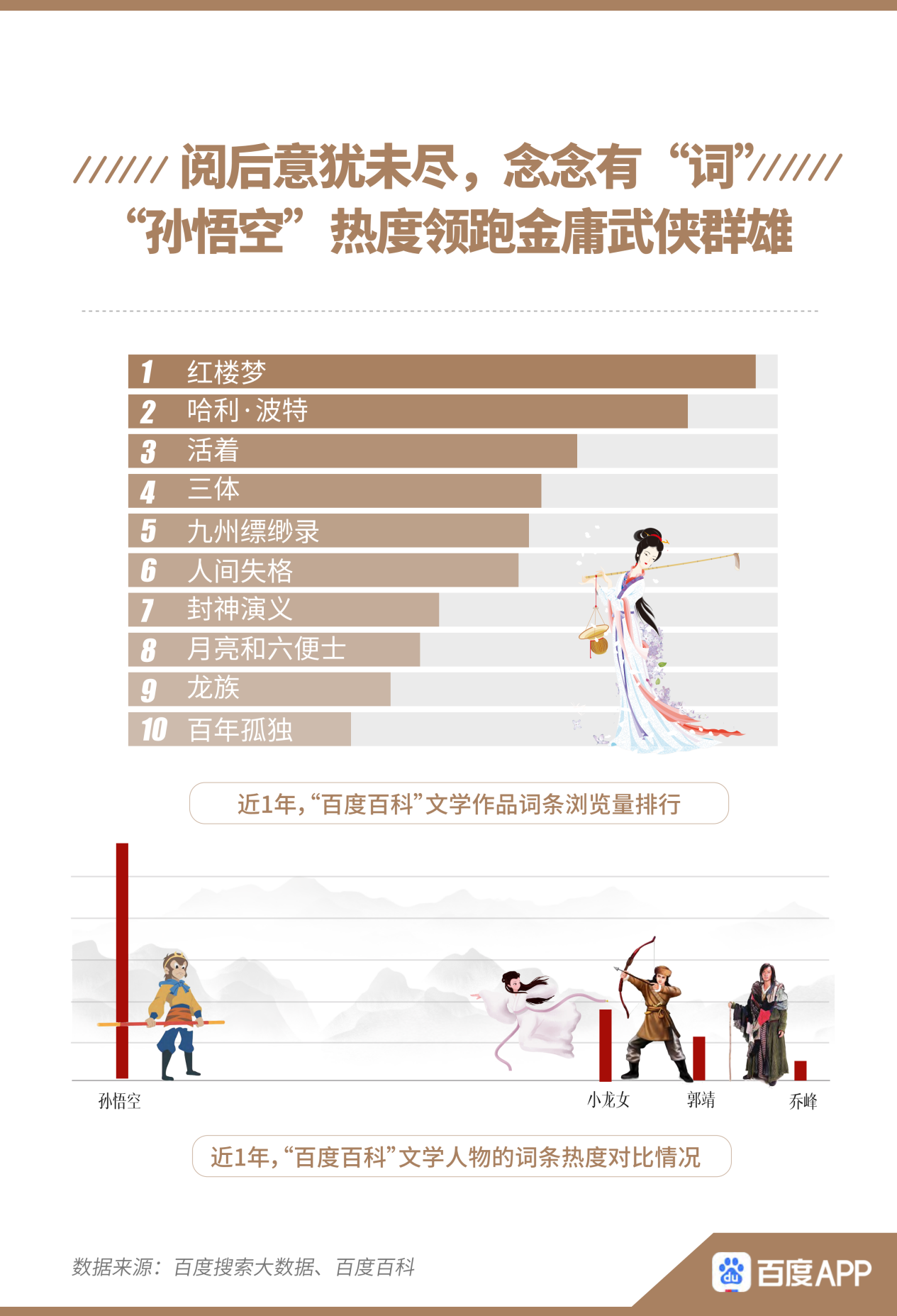 而百度百科的數(shù)據(jù)表明,人們在閱讀經(jīng)典書籍后,點擊詞條查看更多背景、釋義也是常態(tài)。《紅樓夢》、《哈利·波特》、《活著》、《三體》是近1年來網(wǎng)友在百度百科瀏覽較多的文學(xué)作品相關(guān)詞條。