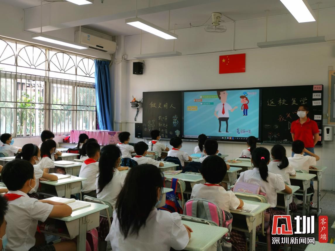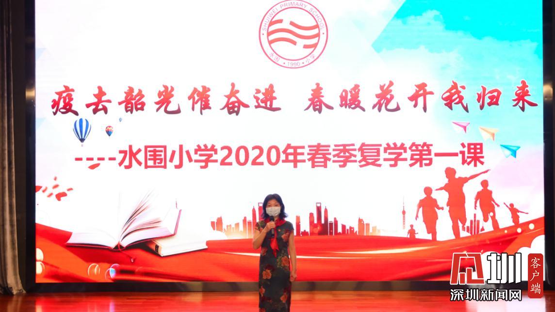 據悉,水圍小學“復學典禮”上午8:40正式開始,出席的嘉賓有福田區教科院教研員、少先隊總輔導員李楠、衛生健康副校長明昭。各班級的學生則帶著口罩,單人單桌在教室內,以觀看直播的方式參加典禮。