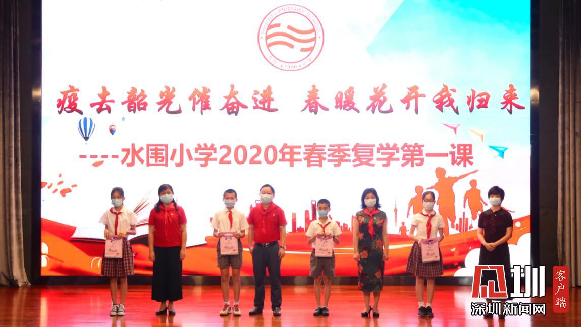 疫情期間,水圍小學“停課不停學,停課不停教”,進行了為期三個月的線上教學。在線上學習的這段時間里,學校涌現了一批在德智體美勞各方面表現優異的同學,他們被評為水圍小學“紅領巾十星”,區教科院李楠、衛生健康副校長明昭、校長劉銳娟、校長李月琴副與副校長楊禹清在此次“復課典禮”中為獲獎學生代表頒獎,并在典禮的最后,為在場的學生代表發放了暖心包。