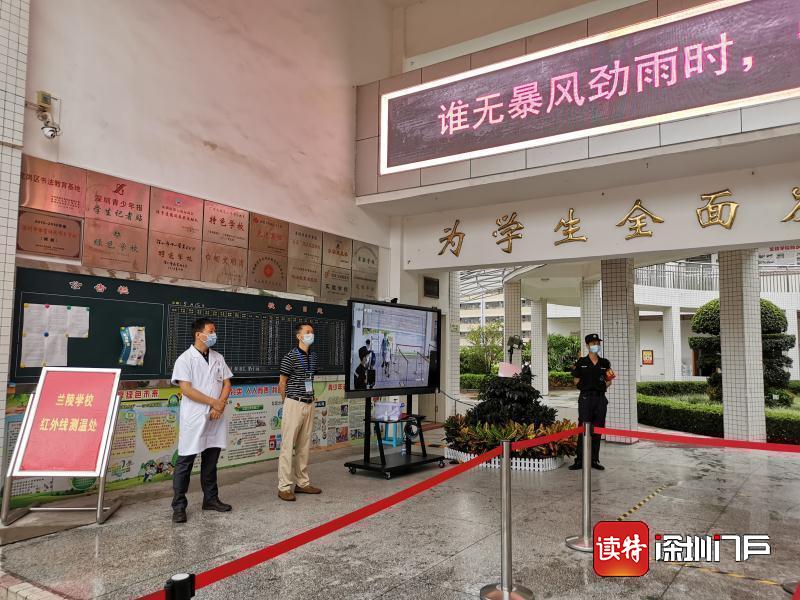 南山區(qū)科創(chuàng)學(xué)校,安保人員正在為返校的學(xué)生測量體溫。