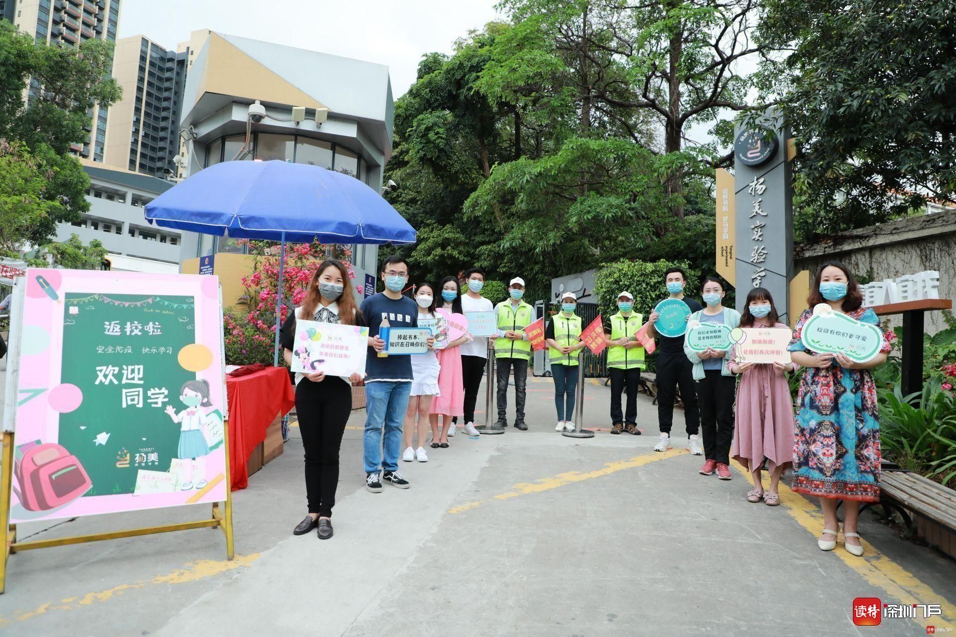 揚美實驗的老師們捧著特制歡迎牌,向返校的孩子們問好。家長義工們身穿綠馬甲、手持小紅旗,在校門附近疏通交通,為孩子們保駕護(hù)航。揚美學(xué)子佩戴口罩,按照錯峰時間表通過體溫測量儀,有序進(jìn)入校園。