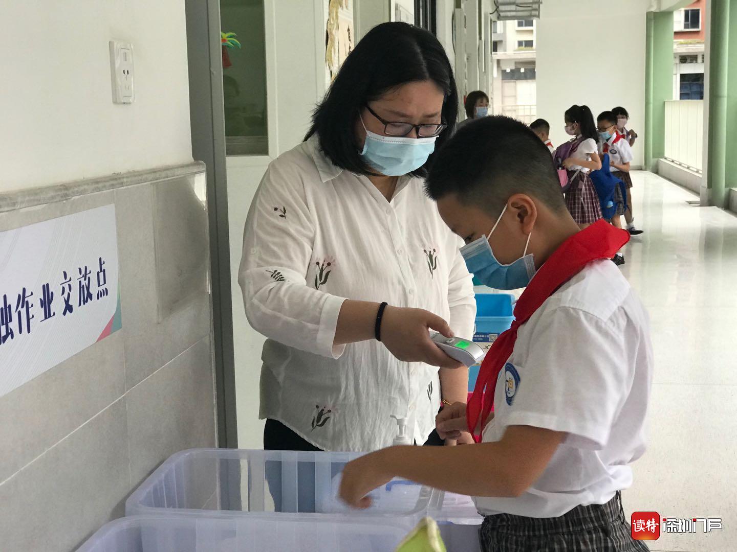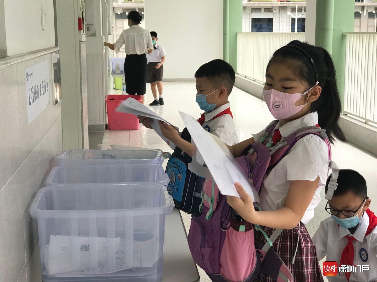 “同學(xué)們早上好!”“老師們好!”18日一大早,龍華區(qū)和平實驗小學(xué)的老師們都早早做好準(zhǔn)備,站在學(xué)校門口,迎接孩子們歸來。在各班教室門口,學(xué)校還貼心的準(zhǔn)備了“無接觸作業(yè)交站點”,同學(xué)們按順序自覺將學(xué)科作業(yè)放進(jìn)箱內(nèi),減少了不必要的接觸。(讀特記者何亞南)