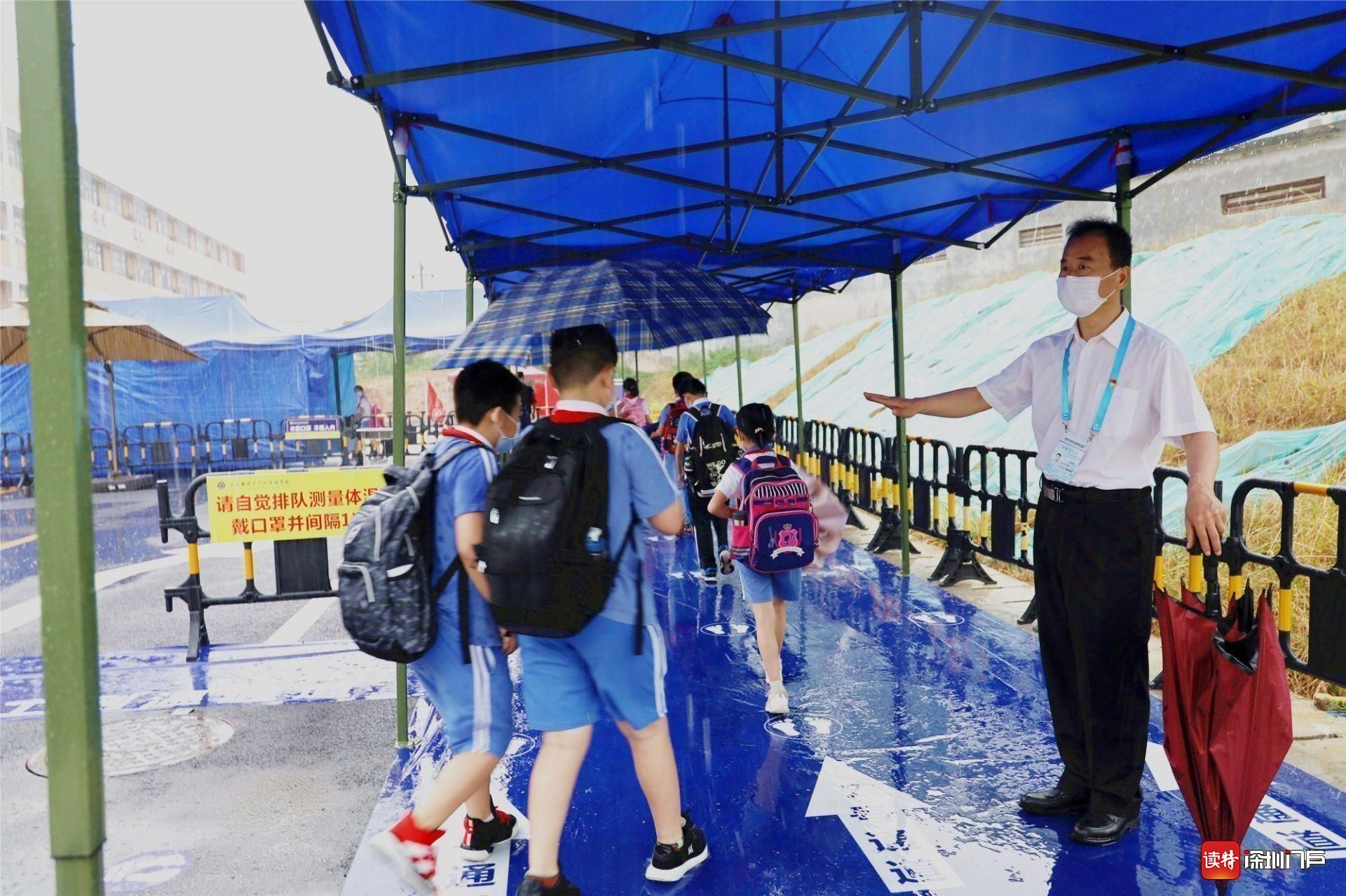 今天,龍城小學(xué)一至三年級的龍小豆們返校啦!盡管龍舟水傾盆而至,但龍小巴學(xué)園為孩子們遮風(fēng)擋雨!為了解決龍小豆們返校“最后0.1公里”,龍城小學(xué)在學(xué)校門外設(shè)立風(fēng)雨連廊,并在東西門內(nèi)搭建藍(lán)色頂棚,方便風(fēng)雨天里龍小豆們?nèi)胄#★L(fēng)里雨里,孩子們,校園都在等你!(讀特記者李麗)