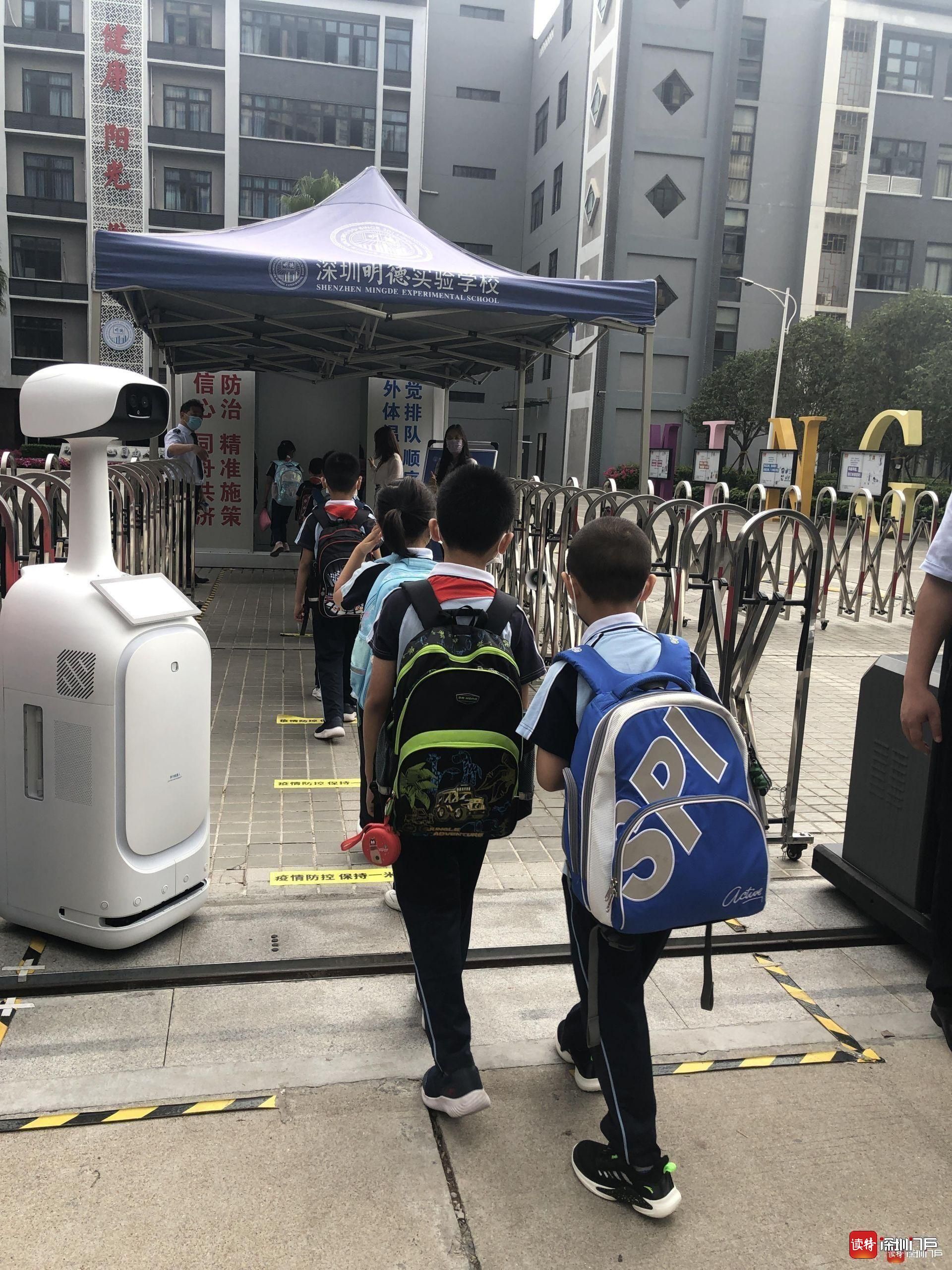 “同學(xué)們好!”“歡迎回來!”從7點起,明德實驗學(xué)校校長魯江與工作人員就在香蜜校區(qū)校門口迎候?qū)W生們,提醒孩子們戴好口罩,也與家長們交流返校事宜。校門口的一臺超氧水消殺機(jī)器人也在積極投入工作,工作人員在后臺控制面板可以監(jiān)測到入校人員的體溫情況。