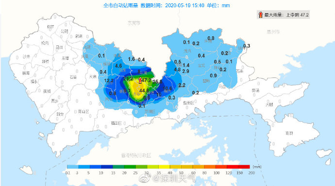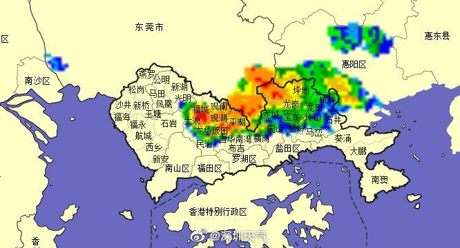 13時05分:目前我市寶安、南山、福田和羅湖局地有陣雨,中午外出吃飯的小伙伴,你們被雨追上了嗎?