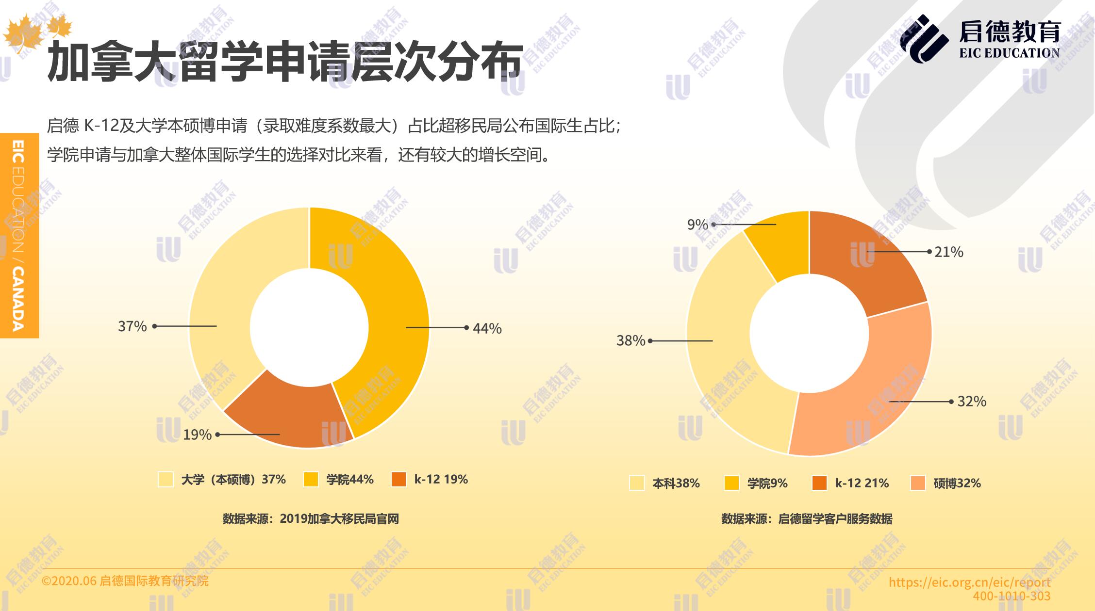 加拿大移民局官網2019年數據顯示,加拿大國際學生中 K-12階段申請占比為19%,大學(本、碩、博)申請占比37%,學院申請占比44%。啟德留學客戶服務數據顯示,2019年通過啟德申請加拿大留學的學生中,申請本科與碩博的學生占比分別為38%與32%,申請學院的占比為9 %,申請中學及其它的占比為21%,與加拿大移民局的官方數據對比來看,中國學生本科留學加拿大的占比較高,且在學院類申請中仍有不小的增長空間。