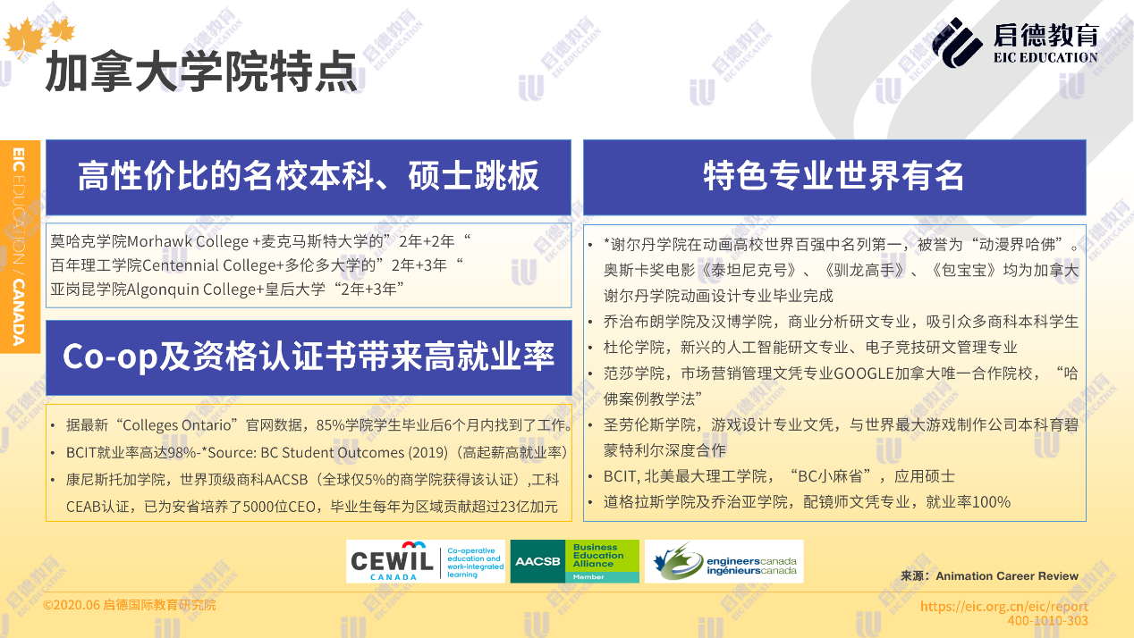 據最新“ Colleges Ontario”官網數據,85 %的學院學生畢業后6個月內找到了工作,91%的雇主對學生表示非常滿意。如康尼斯托加學院,擁有世界頂級商科 AACSB與工科 CEAB認證,為安省培養了5000位 CEO,畢業生每年為區域貢獻超過23億加元。而奧斯卡獎電影《泰坦尼克號》、《馴龍高手》、《包寶寶》均為加拿大謝爾丹學院動畫設計專業畢業完成。北阿伯塔學院的納米技術專業,杜倫學院的人工智能專業,道格拉斯學院的配鏡師專業,范莎學院的飛機維修專業也是世界有名的特色專業。