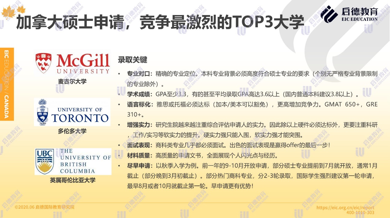 據啟德留學加拿大項目介紹,加拿大碩士申請競爭最激烈的三所大學為麥吉爾大學、多倫多大學與英屬哥倫比亞大學。申請人 GPA至少達到3.3,有的甚至要求平均錄取 GPA高達3.6以上(國內普通本科建議3.8以上);雅思或托福必須達標(加本 /美本可以豁免), GMAT650+, GRE310+;除硬件必須達標外,加拿大名校注重科研、工作 /實習等軟實力的提升;商科類專業幾乎都必須面試。