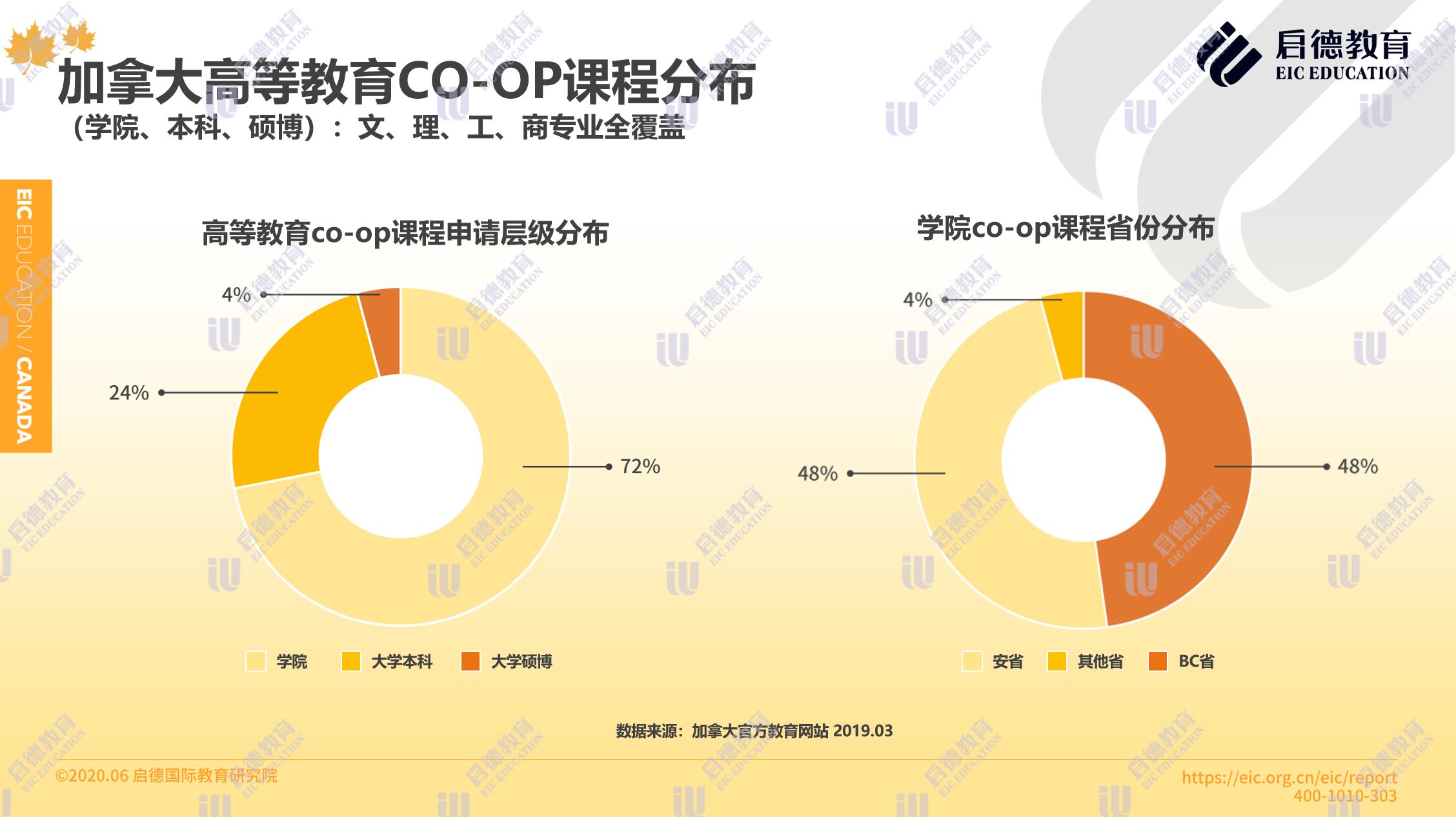 加拿大官方教育網站數據顯示,加拿大高等教育普遍開設覆蓋文、工、理、商全專業的 Co - op帶薪實習課程,其中學院的 Co - op課程占比最多(72% ),其次是大學本科(24% )與大學碩博(4% )。在學院 Co - op課程的省份分布上,安大略省與英屬哥倫比亞省平分秋色,各占48%。