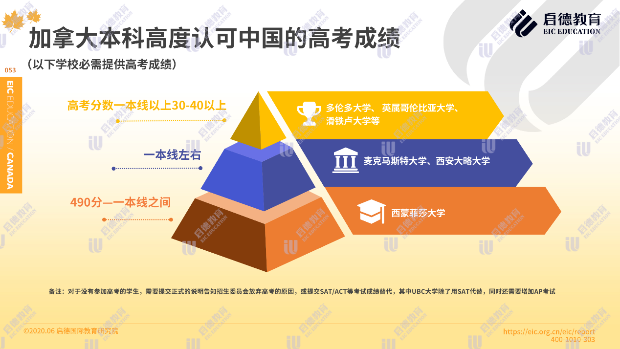 加拿大本科認可中國的高考成績,其中多倫多大學、英屬哥倫比亞大學、麥吉爾大學、滑鐵盧大學等要求高考分數一本線30-40分以上,阿爾伯塔大學、皇后大學、麥克馬斯特大學、西安大略大學要求一本線左右,西蒙菲莎大學、維多利亞大學要求490分至一本線之間。此外,申請商科專業的學生語言成績平均需要達到雅思7分,獲得麥吉爾大學、多倫多大學、英屬哥倫比亞大學熱門專業錄取的學生雅思分數大多達到7.5分。理工科學生6.5分的雅思成績可以獲得名校的青睞,文科學生的雅思成績則需要達到7分。