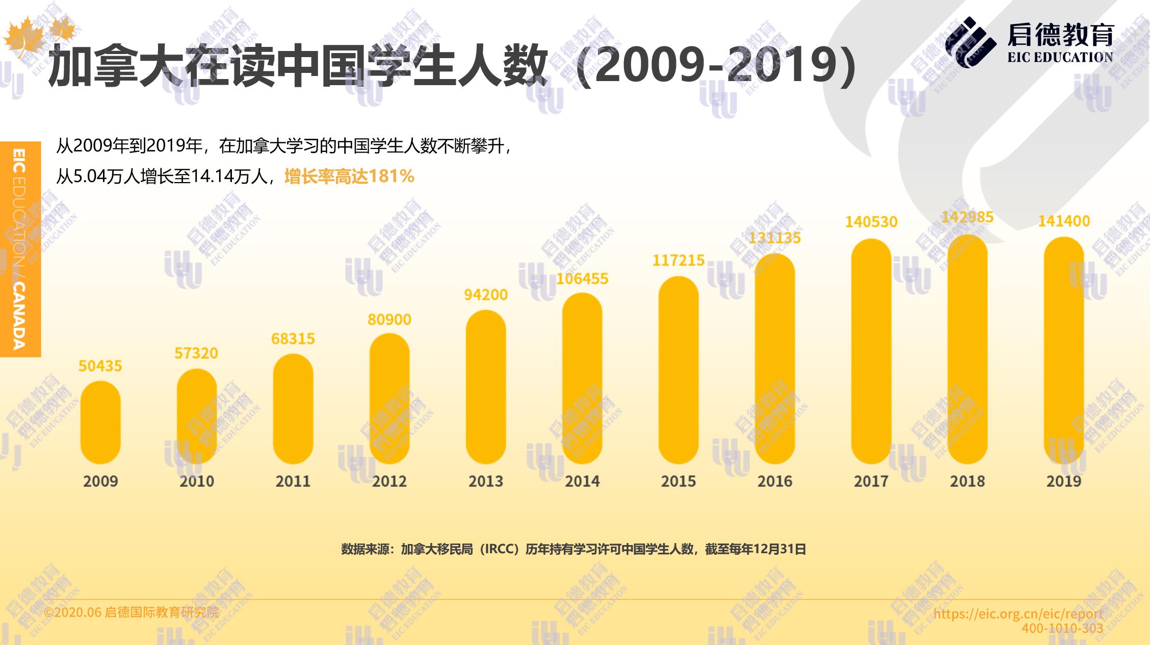 一直以來,加拿大都是中國學生四大熱門留學目的地之一。對于中國意向留學生來說,加拿大擁有教育質量高、留學選擇靈活豐富、性價比高等優勢。加拿大移民局( Immigration, Refugees and Citizenship Canada )公布的學習許可持有者數據顯示,2019年度約有14.14萬中國學生在加拿大留學,占加拿大全部國際留學生的22.1%。中國學生人數從2009年的5.04萬人增長至2019年的14.14萬人,增長率高達181%。