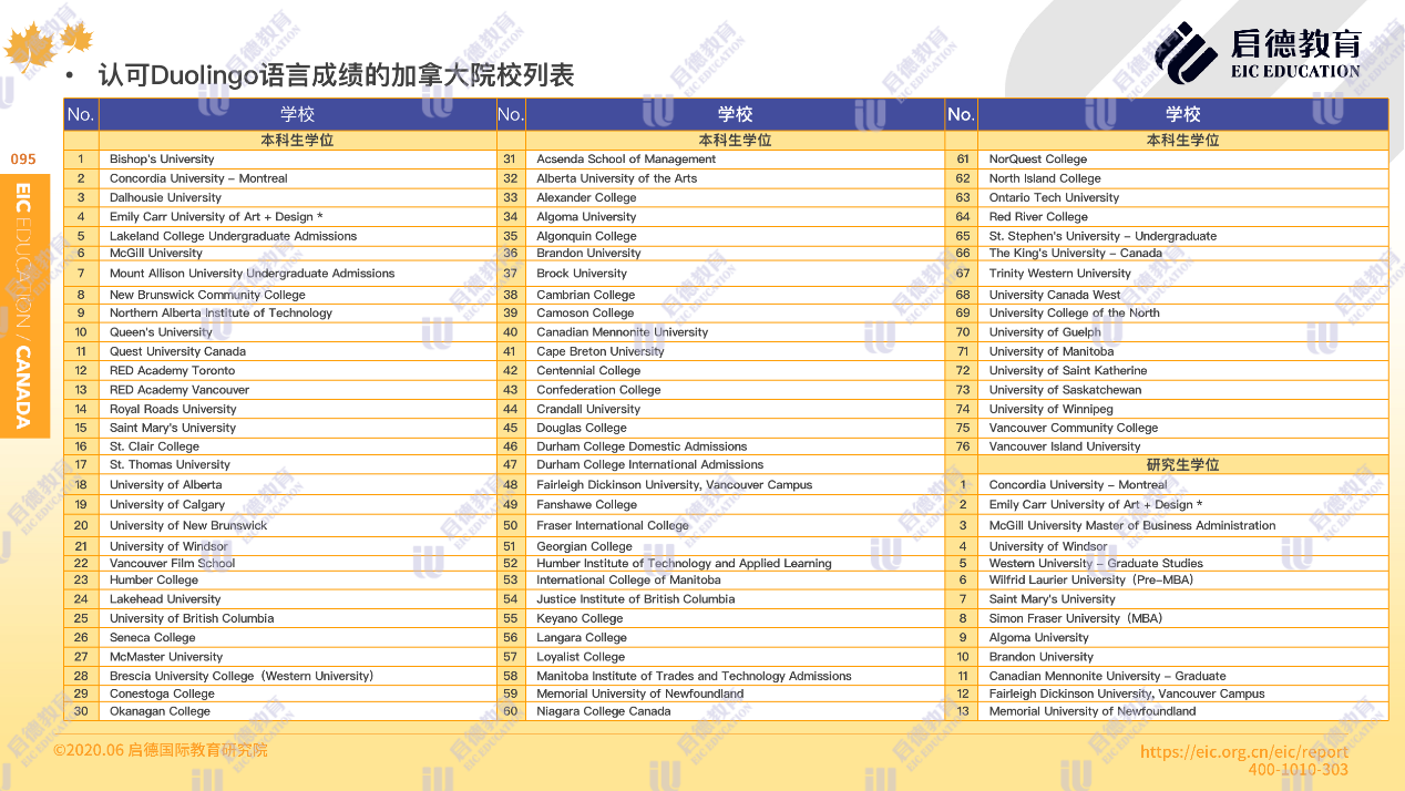 據了解,目前多鄰國 Duolingo English Test語言成績被加拿大高校的76個本科生學位、18個研究生學位,及20所中學所認可。此外,加拿大學術英語測試 CAEL考試已于2019年1月在中國內地開放考試,具有出分快(8天),聽說讀寫一次性完成,無須額外口語面試等特點,目前北上廣均設有考場。