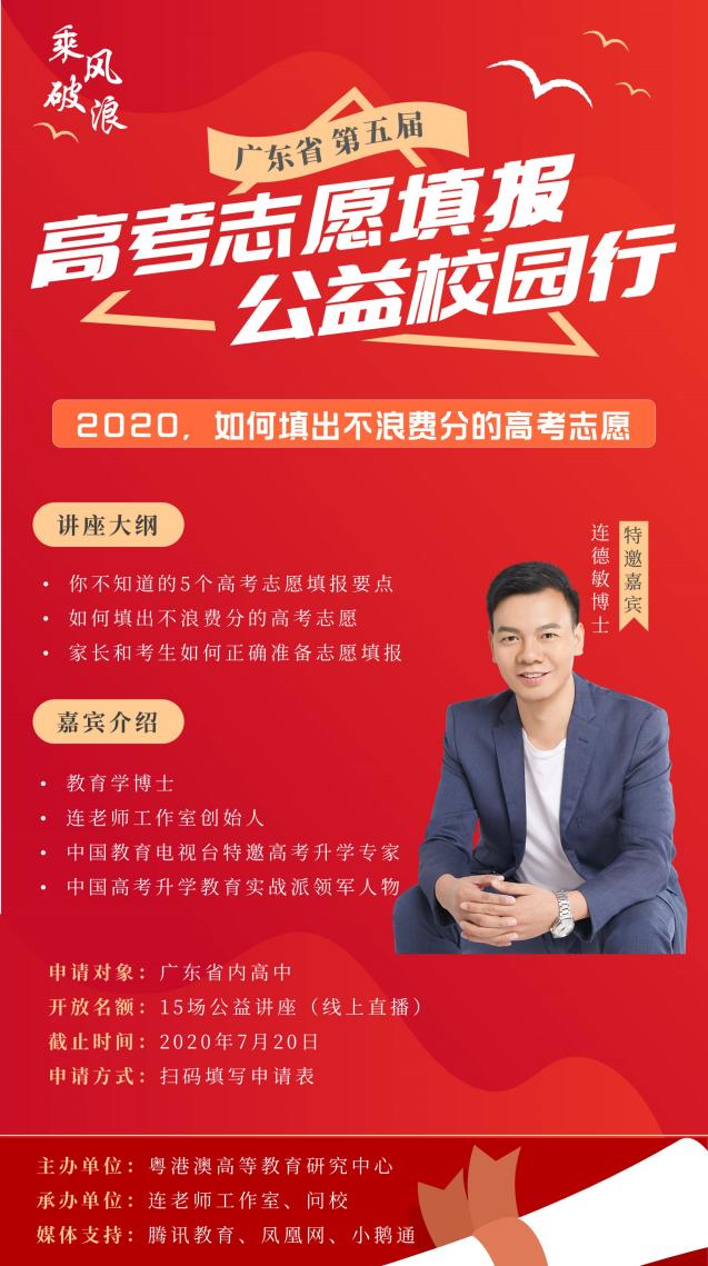 見圳客戶端·深圳新聞網2020年7月9日訊 (記者 陳彬)高考是每一位高三學子夢想的起點,但高考不只是一場考試,還有考試之后的志愿填報;如何科學、專業的填報志愿,直接關系著考生能否獲得心儀大學和專業的錄取。7月6日,以《2020,如何填出不浪費分的高考志愿》為主題的廣東省第五屆高考志愿填報公益校園行正式啟動,該活動由粵港澳高等教育研究中心主辦,連老師工作室承辦,將面向廣東省內高中,以學?;虬嗉墳閱挝唬e辦15場志愿填報公益講座,講座全程特邀連德敏博士擔任主講嘉賓。