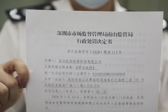 經過近2個月的調查,7月21日,深圳悅來悅愛科技有限公司正式簽收深圳市市場監督管理局南山分局粵海所開出的行政處罰決定書,罰款2000元。