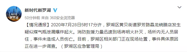 【情況通報】2020年7月28日5時17分許,羅湖區黃貝街道羅芳路晶龍燒臘店發生疑似煤氣瓶泄漏爆炸起火。消防救援力量迅速到場將明火撲滅,場所內無人員居住,事件未造成人員傷亡。目前,羅湖區相關部門正在現場處置,事件具體原因正在進一步調查。(羅湖區應急管理局)