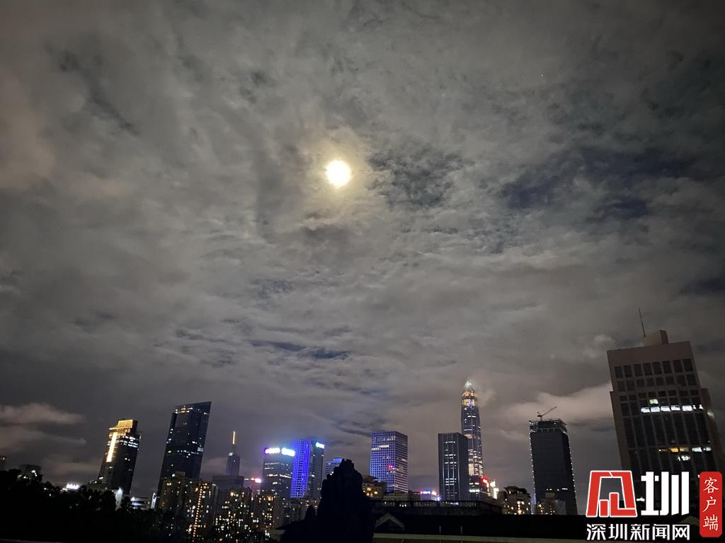 8月3日當晚,深圳降雨暫歇,月亮也露出笑容。當晚月亮升起時刻為19:06,不少深圳網友都拍到了圓月,并分享到社交平臺上。