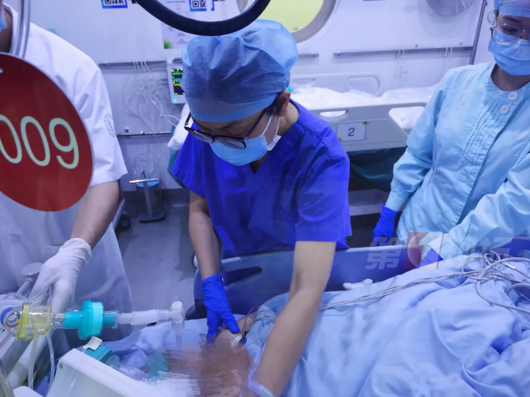當時人是神智不清的,有頻繁的抽搐,考慮這個頻繁抽搐,還是跟她心跳驟停之后,大腦缺血、缺氧狀態(tài)有關系。我們樓下?lián)尵仁遥芸炀徒o她一個評估全身的狀態(tài),再一個就是第一時間,我們就給她緊急安排了高壓氧的治療。