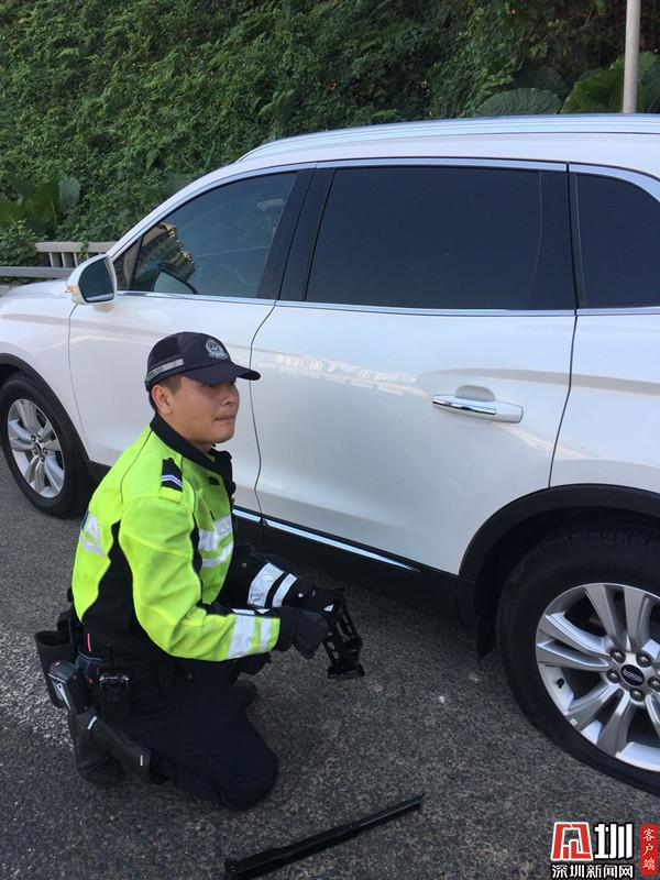 事情發生在10月11日早上10時30分許,劉先生駕車出外辦事,車輛行駛至東環高架西往東方向時,突然一聲巨響左后輪輪胎爆裂車輛半路拋錨,當時正值交通早高峰,過往車輛不斷,故障車輛停在道路中間導致路段交通擁堵,車主劉先生一時間不知所措,只能留在原地等待救援。此時正在執行巡邏任務的羅湖交警鐵騎組長陳展廷見狀,立即停下警車上前查看情況,了解情況后,為了緩解該路段的交通擁堵,防止出現交通意外,陳展廷立即讓劉先生把車停靠在最右側車道,然后安排隊員用警車在故障車輛周邊設置出了安全警戒區域,另一位隊員則對過往車輛進行指揮疏導及勸慰駕駛人不要著急,在安全區域等待,陳展廷則俯下身為爆胎車輛更換輪胎。約15分鐘的忙碌后,三位鐵騎隊員已滿身是汗,但在他們的密切協調配合下,快速幫助駕駛人劉先生擺脫困境,險情在最短時間內被及時排除,道路交通秩序也恢復正常,這暖心一幕讓劉先生很是感動,緊緊握著陳展廷同志的手連聲表示感謝。