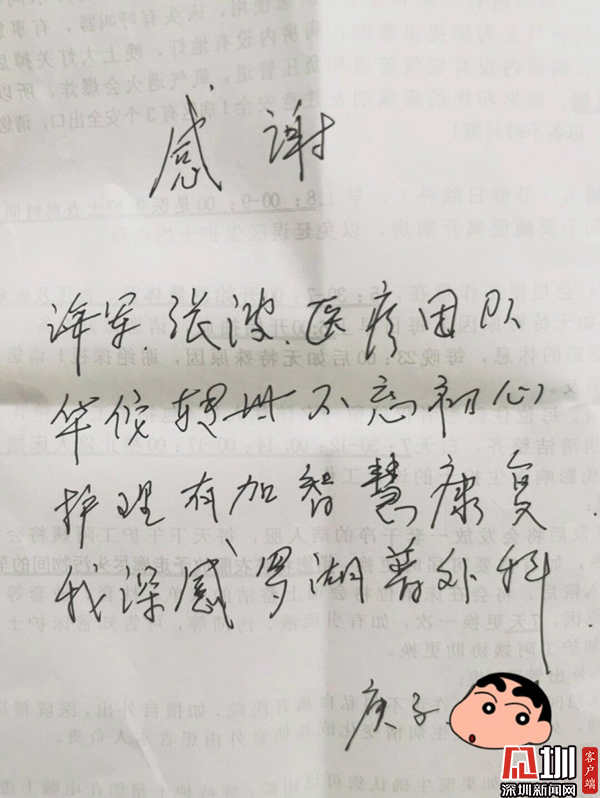 深圳新聞網訊(見圳客戶端、深圳新聞網記者 郭含笑 通訊員 許陽)日前,羅湖醫院普外科收到了一封來自患者的親筆感謝信,雖然用紙普通,內容簡單,但字里行間無不流露出寫信人的感激之情。