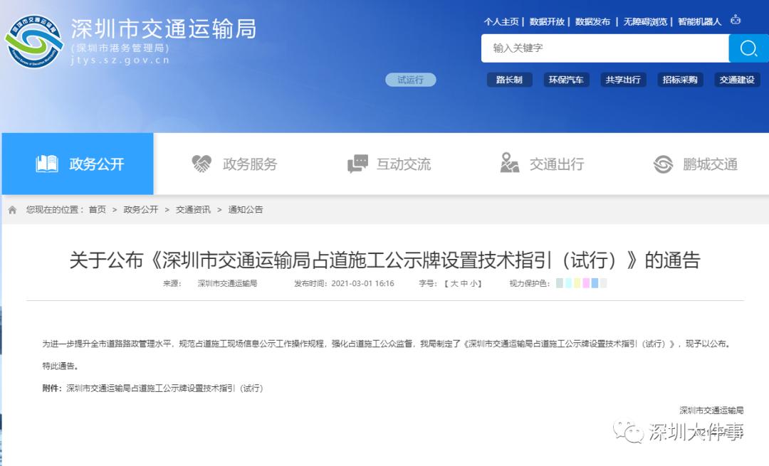 為加強道路管理,規范道路占用、挖掘行為,強化占道施工公眾監督,深圳市交通運輸局編制了《占道施工公示牌設置技術指引(試行)》(以下簡稱《指引》),對占道施工公示牌設置要求,張貼范圍都有了明確的標準和要求。