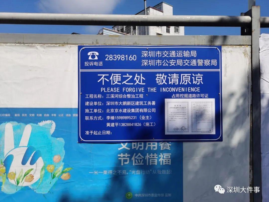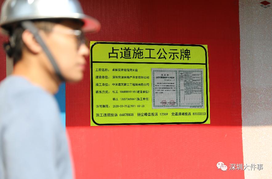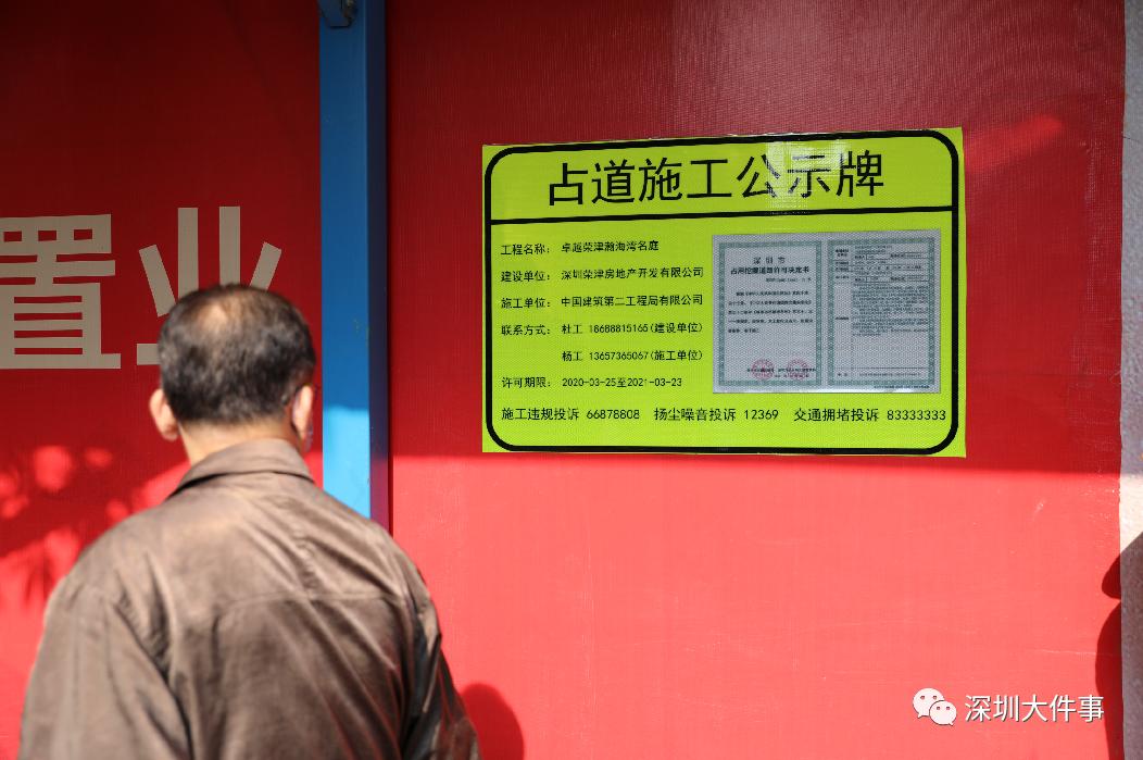 3月9日,我們在鹽田區卓越榮津瀚海灣名庭施工現場看到,圍欄外每隔50米就張貼了最新版的占道施工公示牌,且在便于行人查閱的顯眼位置。