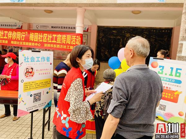 見圳客戶端· 深圳新聞網3月16日訊(記者 郭含笑 實習生 覃鈺清 通訊員 李珍鳳 張亮亮)為進一步提高社會工作的影響力,樹立社會工作專業形象,3月16日下午,深圳市清水河街道梅園社區黨委、深圳市東西方社工服務社駐梅園社區黨群服務中心的社工開展了“幸福梅園 社工伴你同行”社工宣傳周活動。