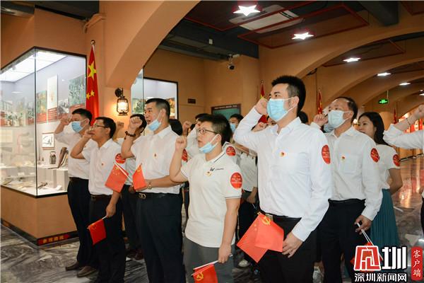 參觀活動結束后,全體成員進行了重溫入黨誓詞環節。在鮮紅的黨旗下,黨員們舉起右拳,在羅湖區委宣傳部二級調研員李文威的帶領下莊嚴宣誓,大家仿佛又看到了自己第一次站在莊嚴的黨旗下宣誓的樣子:“我志愿加入中國共產黨,擁護黨的綱領,遵守黨的章程……”一聲聲鏗鏘有力的入黨誓詞在博物館中回響。