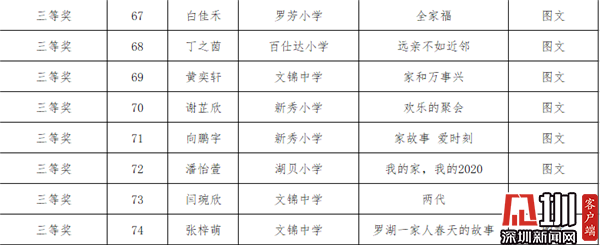 見圳客戶端·深圳新聞網2021年6月1日訊(記者 李慧)6月1日,羅湖區“家庭文明公益廣告”及“我家年度故事”征集活動獲獎名單公布,其中,18個“家庭文明公益廣告”和74個“年度故事”圖文作品獲獎。