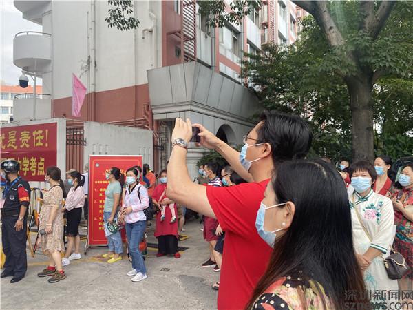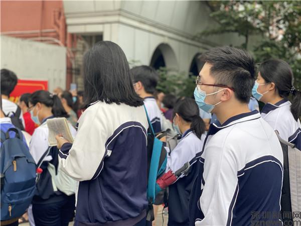 當天上午7:50,記者來到羅湖區翠園中學和羅湖外語學校門口,只見考生們已陸續排隊領取準考證,有序進入考場。許多穿著“紅旗袍”戴著“紅口罩”的家長們在紛紛叮囑孩子們后,已在校門口等候。