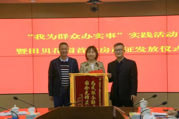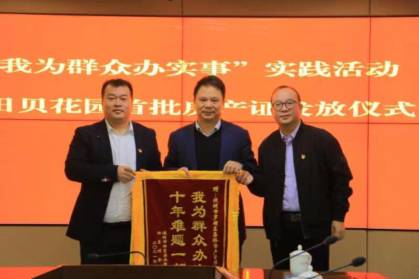 儀式當天,5名村民代表從羅湖區領導的手中接過了房產證,田貝股份合作公司向有關單位贈送錦旗表示感謝。