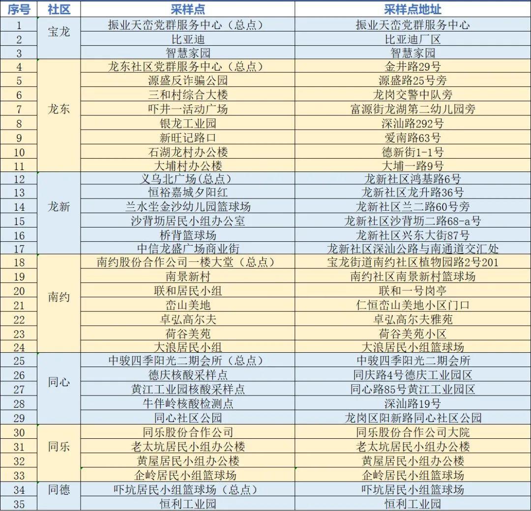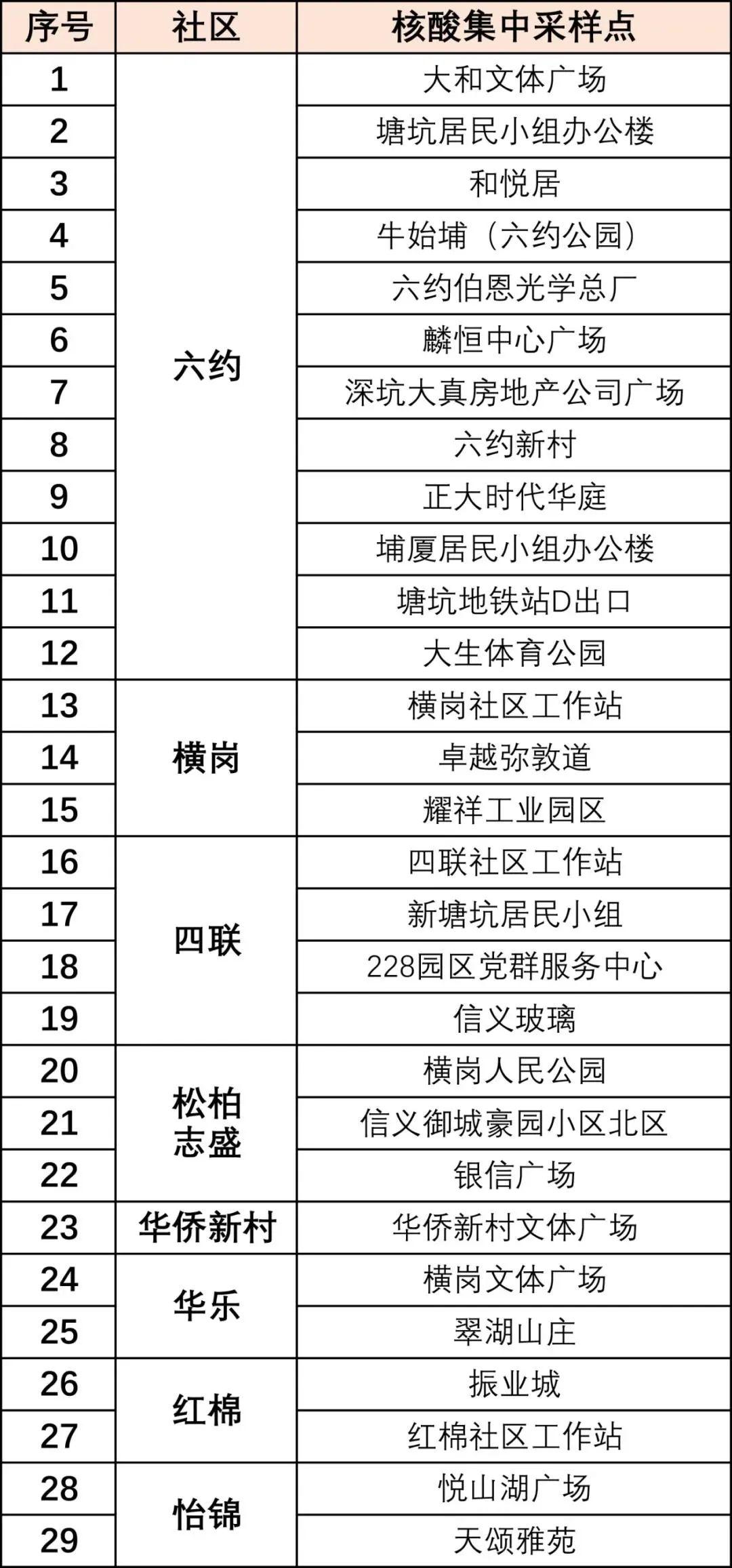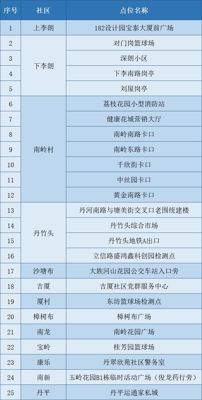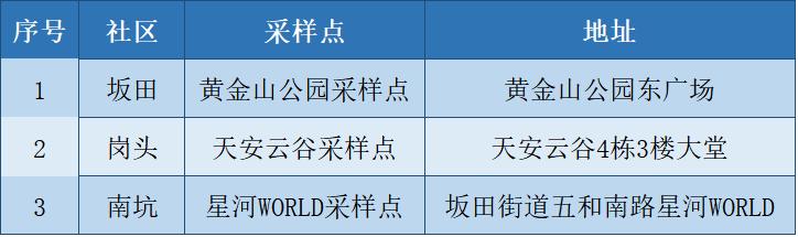 根據疫情防控需要,為最大程度保障人民群眾生命安全和身體健康,龍崗區各街道于1月10日開展新一輪免費核酸檢測以下點位統計截至1月10日。各點位動態更新請以社區通知及現場實際情況為準。