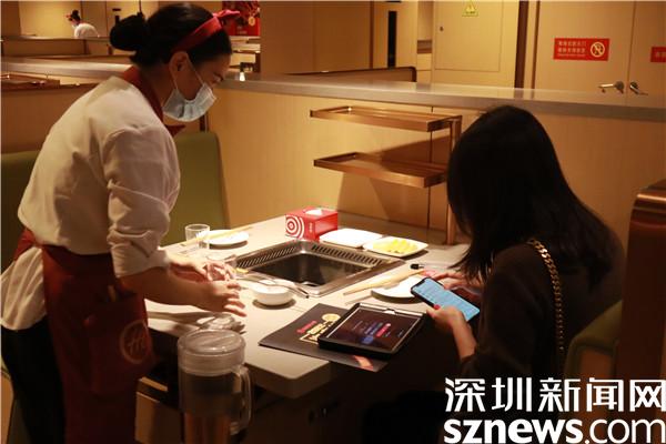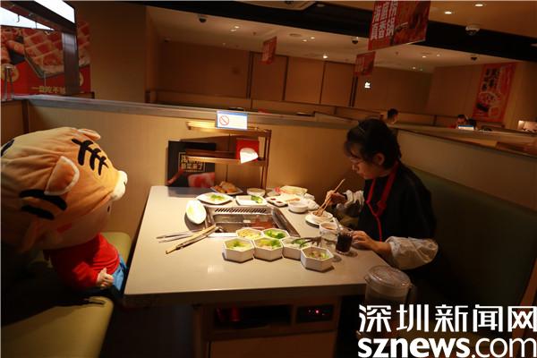 冬季是火鍋消費的旺季,在用餐高峰期,位于深圳市羅湖區這家連鎖火鍋店里,可見門口顯眼處貼著“半份菜 滿份愛”的海報,店內還有光盤行動等標語,還有一名光盤行動倡導員在餐廳內不時給消費者溫馨提示,倡導顧客適量點餐。