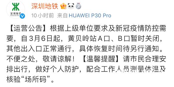 上午8時,深圳地鐵發布運營公告:3月6日起,黃貝嶺站A口、B口暫時關閉,其他出入口正常通行。