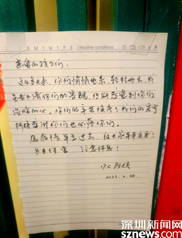 “親愛(ài)的孩子們,這么多天來(lái),你們悄悄地來(lái),輕輕地去,我雖看不清你們的容顏,但能感受到你們溫暖的心。你們的辛苦換來(lái)了我們的安寧,阿姨感謝你們也心疼你們?!边@是來(lái)自桂園街道華瑞大廈B座居民的手寫(xiě)感謝信,一句“親愛(ài)的孩子們”戳中了現(xiàn)場(chǎng)工作人員的心,讓人忍不住淚目。