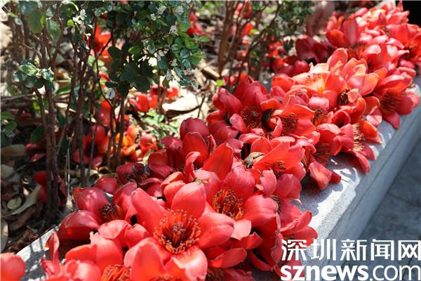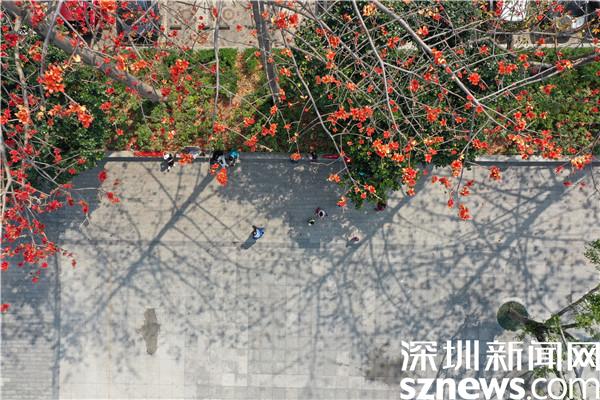 赤焰灼灼的木棉花開了,染紅了轄區半邊天際,與深圳藍相映成趣。一朵朵嫣紅的花兒垂滿枝頭,沐浴著暖春的陽光綻放,也點綴著花下賞花的居民們。