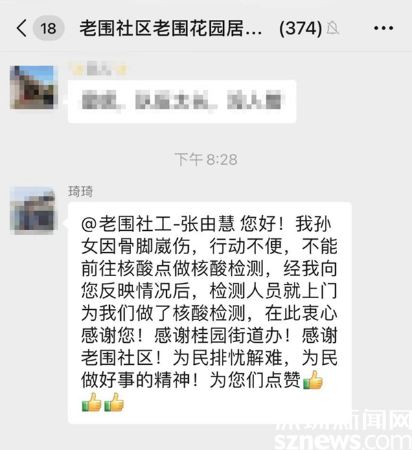 讀特客戶端·深圳新聞網2022年7月14日訊(記者 劉嘉敏 通訊員 楊紀歐)7月12日晚上8點多,羅湖區桂園街道老圍社區的居民琦琦在居民微信群里向社工張由慧說:“您好!我孫女因骨腳崴傷,行動不便,不能前往核酸點做核酸檢測,經我向您反映情況后,檢測人員就上門為我們做了核酸檢測,在此衷心感謝您!感謝桂園街道辦!感謝老圍社區!為民排憂解難,為民做好事的精神!為你們點贊。”