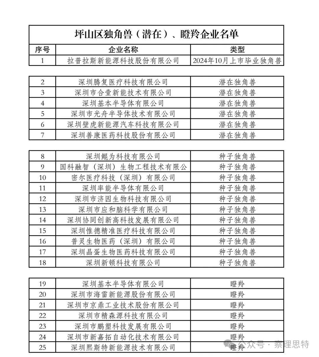 以坪山區為例,坪山區企業拉普拉斯入選全市新晉獨角獸企業,也是其中3家上市畢業獨角獸企業之一。此外,坪山區有6家企業入選潛在獨角獸企業,11家企業入選種子獨角獸企業,7家企業入選瞪羚企業。盡管坪山只有一家企業入選全市新晉獨角獸企業,但是從數據來看,坪山區潛在獨角獸企業、種子獨角獸企業和瞪羚企業很多,后勁和潛力之大可以期待。