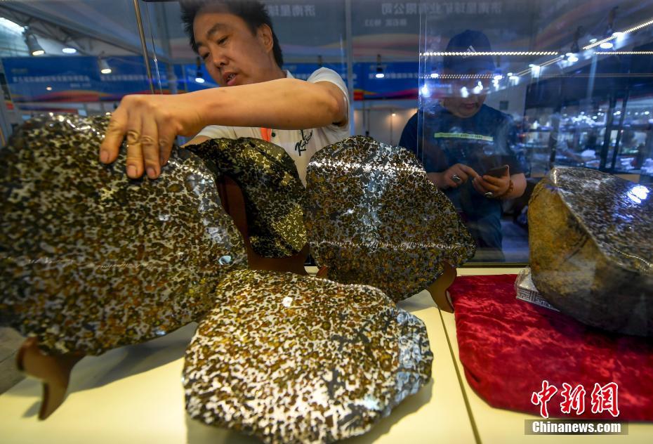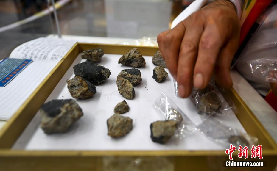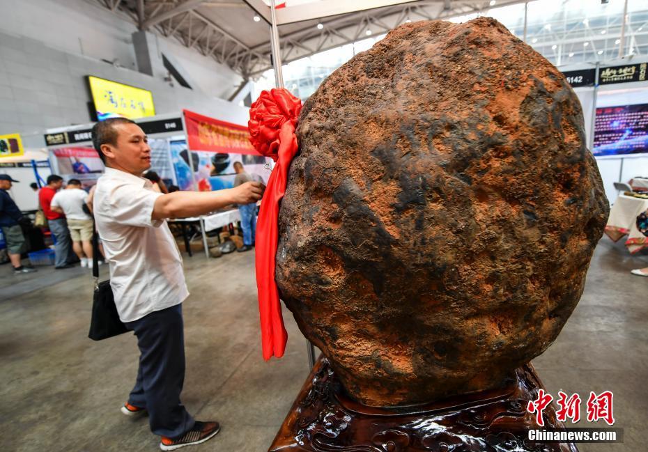 6月15日,第十一屆新疆觀賞石、和田玉精品博覽會(huì)在位于新疆烏魯木齊市紅光山的新疆國(guó)際會(huì)展中心開(kāi)幕,本次博覽會(huì)參展種類(lèi)涵蓋珠寶、玉石、礦石、隕石、觀賞石等,吸引眾多奇石玩家到場(chǎng)“以石會(huì)友”,打造獨(dú)具特色的“品石”盛宴。圖為曾引起各方關(guān)注,6月1日降落在云南西雙版納州景洪市的隕石“空降”本屆石博會(huì)展出。中新社記者劉新 攝