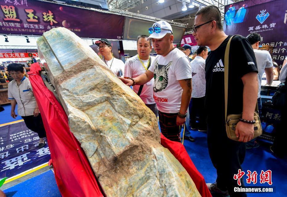 6月15日,第十一屆新疆觀賞石、和田玉精品博覽會(huì)在位于新疆烏魯木齊市紅光山的新疆國(guó)際會(huì)展中心開(kāi)幕,本次博覽會(huì)參展種類(lèi)涵蓋珠寶、玉石、礦石、隕石、觀賞石等,吸引眾多奇石玩家到場(chǎng)“以石會(huì)友”,打造獨(dú)具特色的“品石”盛宴。圖為產(chǎn)自新疆阿勒泰地區(qū)富蘊(yùn)縣庫(kù)瑪拉山重量近1噸、價(jià)值1.5億元人民幣的海藍(lán)寶原礦石。中新社記者劉新 攝