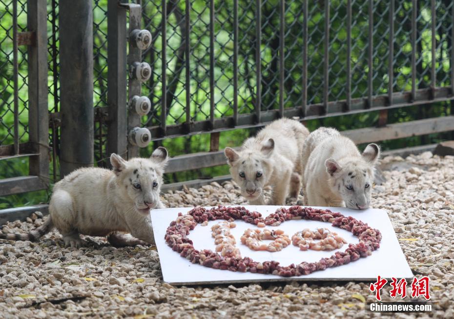 7月10日,雪虎五胞胎分享“肉餡蛋糕”。當日,濟南野生動物世界五胞胎雪虎誕生滿百日,正式與游客見面。中新社記者 張勇攝