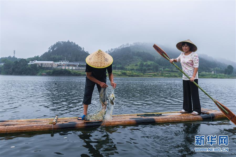 8月2日,淳安縣汾口鎮紅星村的漁民乘著竹排,在千島湖的支流武強溪上收網撈魚。新華社記者 徐昱 攝