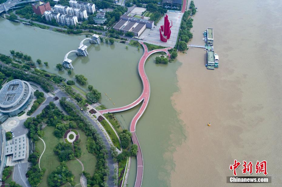7月10日,航拍長江與南京秦淮河交匯處,江水與河水“涇渭分明”。當日,江蘇水利廳發布的水情信息顯示,長江南京段水位已降至警戒線以下。中新社記者泱波 攝