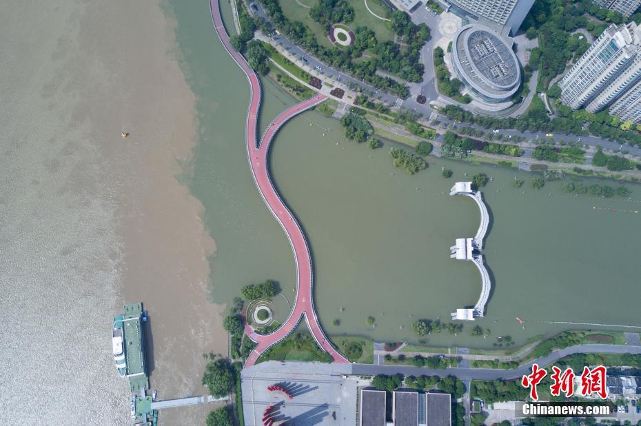 7月10日,航拍長江與南京秦淮河交匯處,江水與河水“涇渭分明”。當日,江蘇水利廳發布的水情信息顯示,長江南京段水位已降至警戒線以下。中新社記者泱波 攝