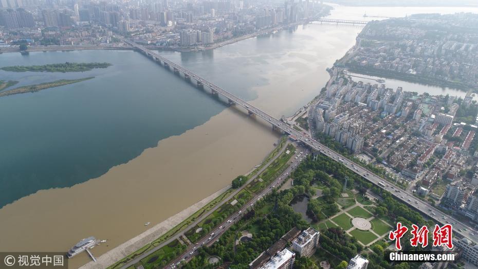 5月7日,湖北省襄陽市,無人機航拍的漢江長虹大橋處涇渭分明的漢江水面。強暴雨沖刷經過去冬今春的田野地表積累的塵土,經支流與主河道匯入時,充滿污泥的洪水與主河道上清澈的丹江水形成難得一見的涇渭分明景觀。王虎攝 圖片來源:視覺中國